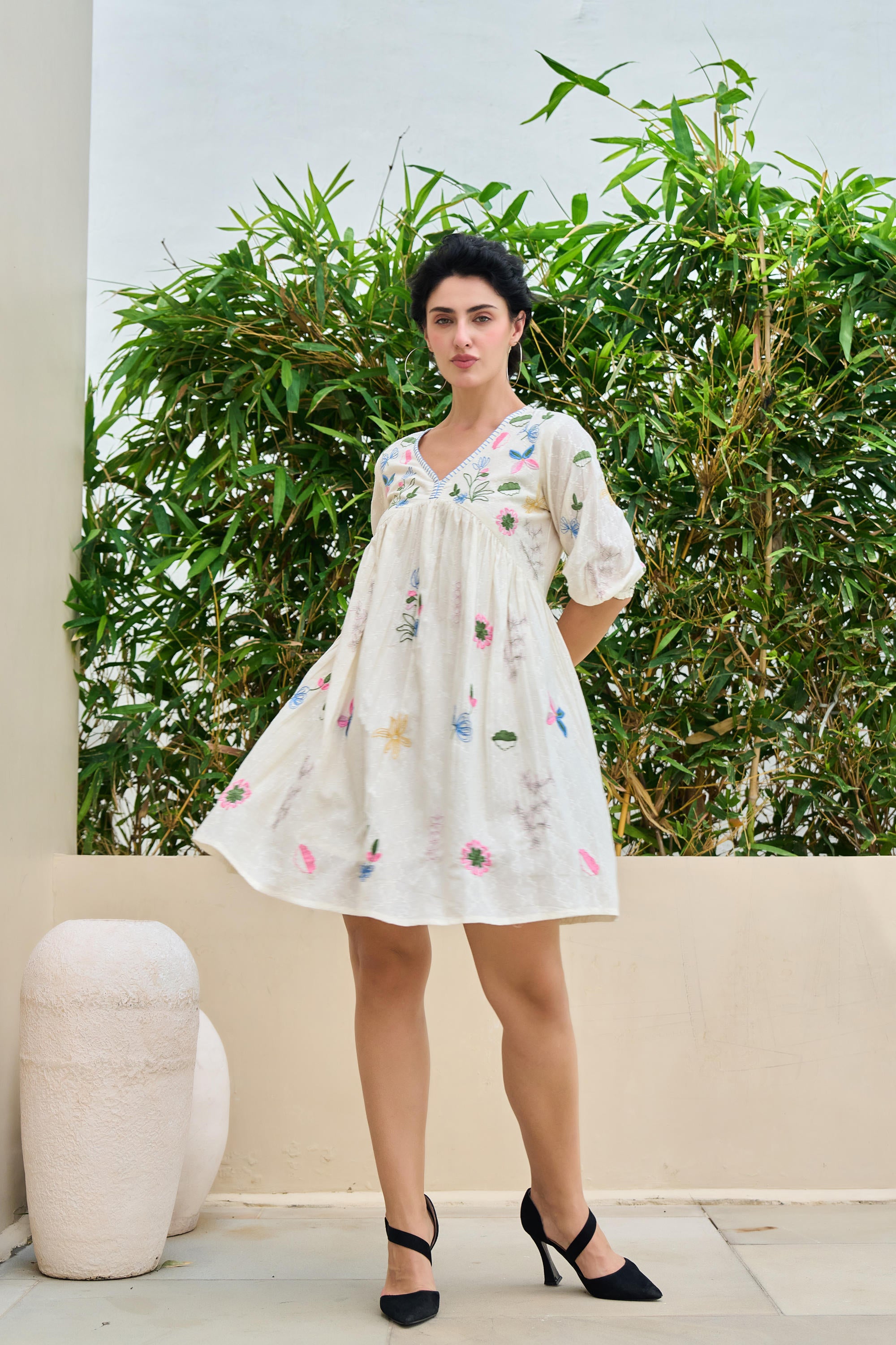 OFF-WHITE FLORAL EMBROIDERED FIT & FLARE SHORT DRESS